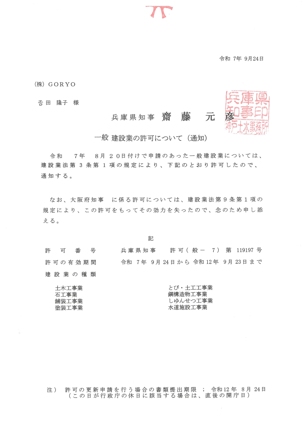| 建設業許可 | 兵庫県知事 許可(般-7)第119197号 |